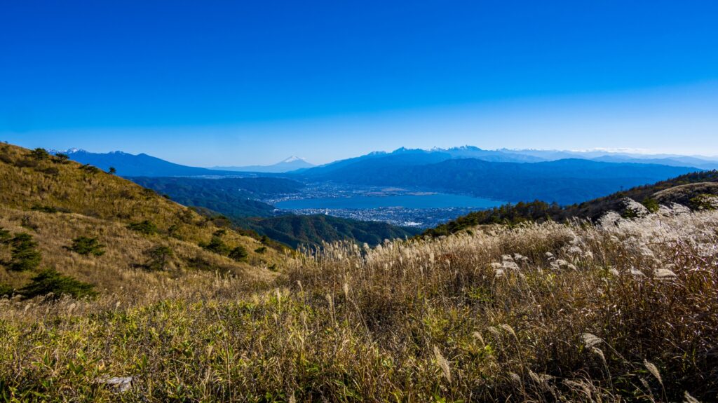 眼下には諏訪湖、その向こうには八ヶ岳連峰や南・中央・北アルプスまで見渡すことができ、晴れた日の眺望は圧巻。
