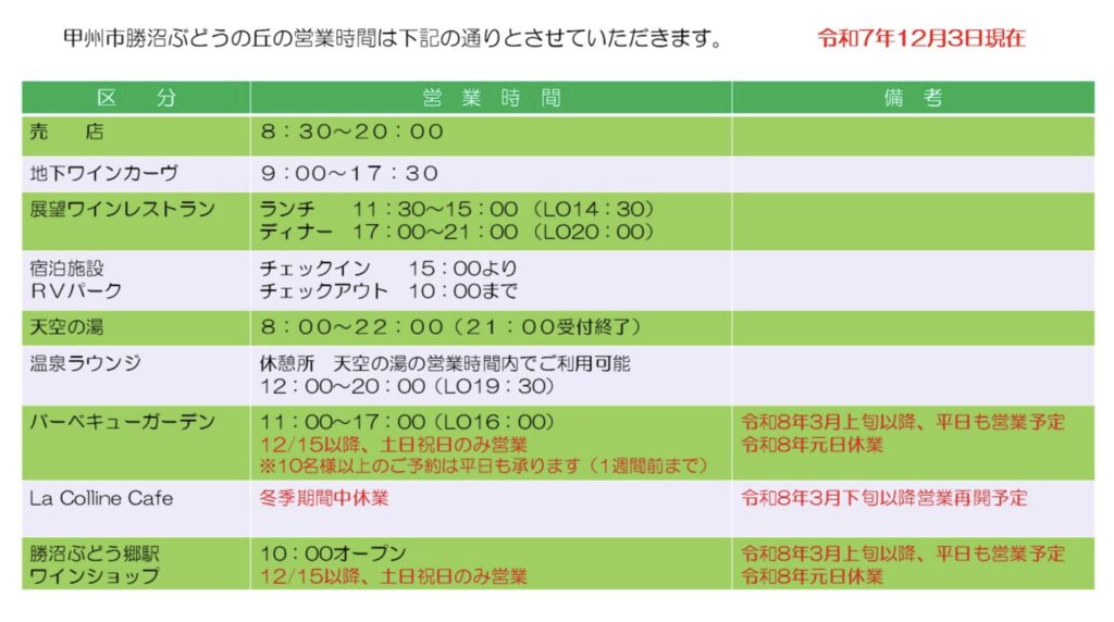 | 冬 | 清里・八ヶ岳・大月は路面凍結の可能性あり。車の場合スタッドレス必須 |