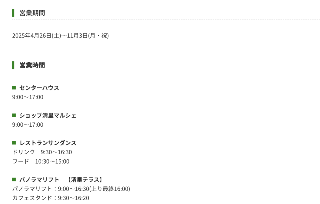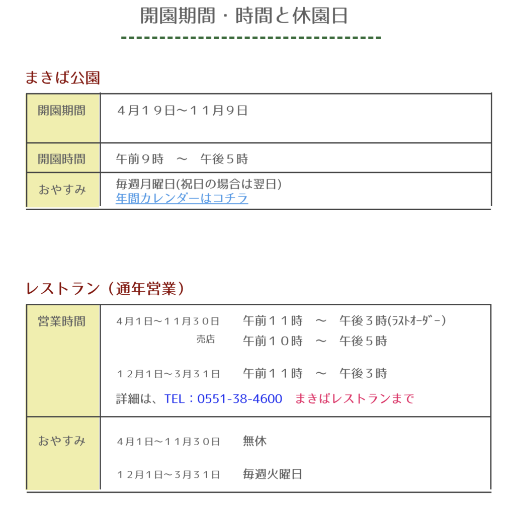 | 営業時間 | くだもの館・わんぱくドーム:午前9時00分~午後5時00分(季節により変更有) その他野外施設:24時間利用可 |